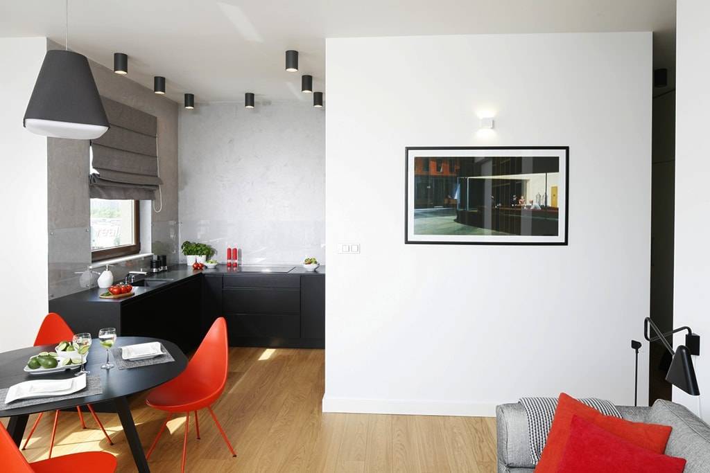 Дизайн больших студий не обходится без декоративных ширм, перегородок или стеллажей. Они могут быть изготовлены из стекла, гипсокартона, дерева или просто ткани. Для функциональности перегородку можно выбрать с нишами для аквариума, книг, ваз или посуды. Подобные конструкции станут настоящим украшением любого интерьера, сочетая в себе красоту и практичность. Раздвижные двери с роликовым механизмом позволят гостям не наблюдать за процессом приготовления пищи. Кроме того, благодаря этому в гостиную не будут проникать посторонние и не всегда приятные запахи.