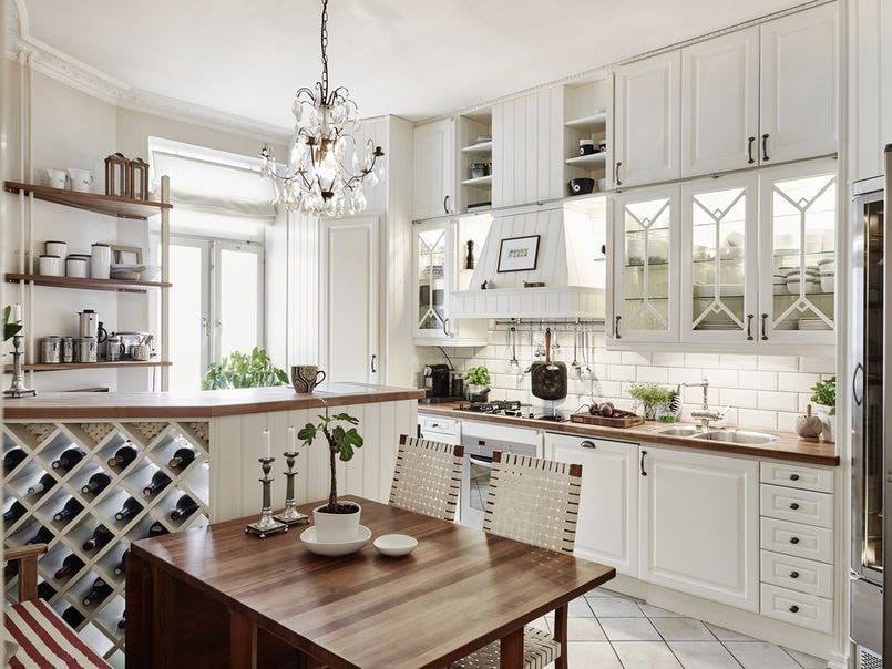 В большинстве случаев дизайн кухни 17 кв. м предполагает наличие мобильной или стационарной перегородки. Иногда планировкой задумана светоизоляция гостиной, особенно если она же является спальней. Перегородка тут просто незаменима.