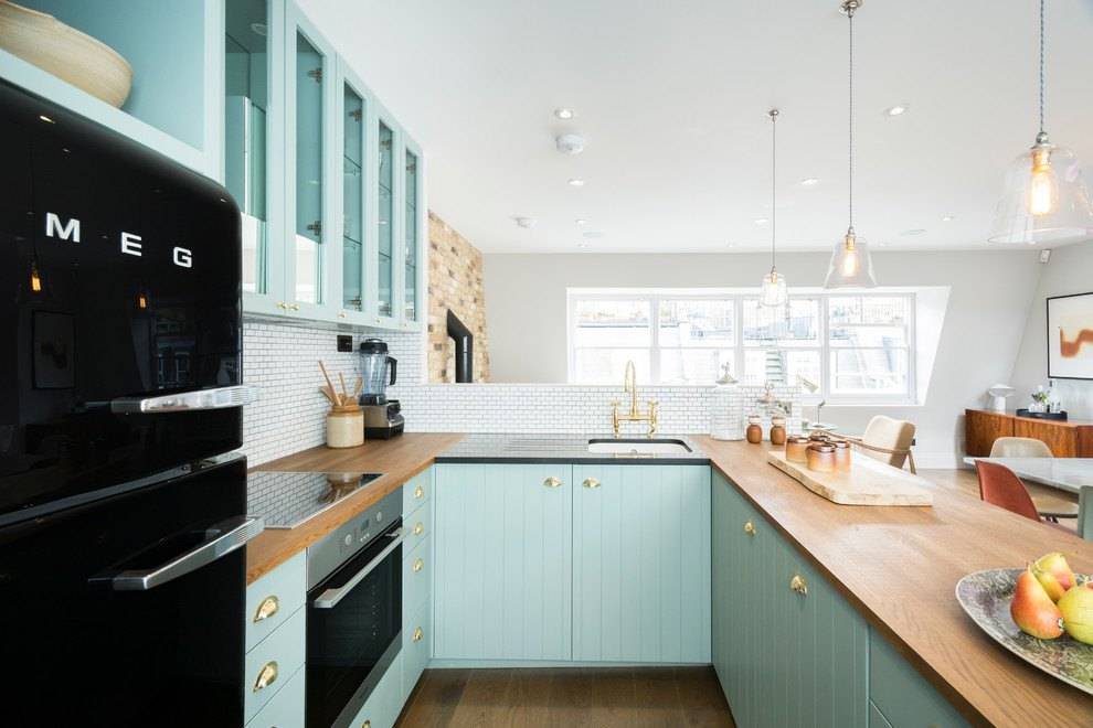 П-образная планировка для кухни площадью 17 квадратных метров — идеальный вариант. Согласно правилам интерьерного дизайна, расстояние между предметами должно быть не менее 1 м, а в такой кухне места будет гораздо больше. За счёт установки дополнительного количества шкафов, в кухне можно хранить много кухонной утвари, различных полезных приспособлений.