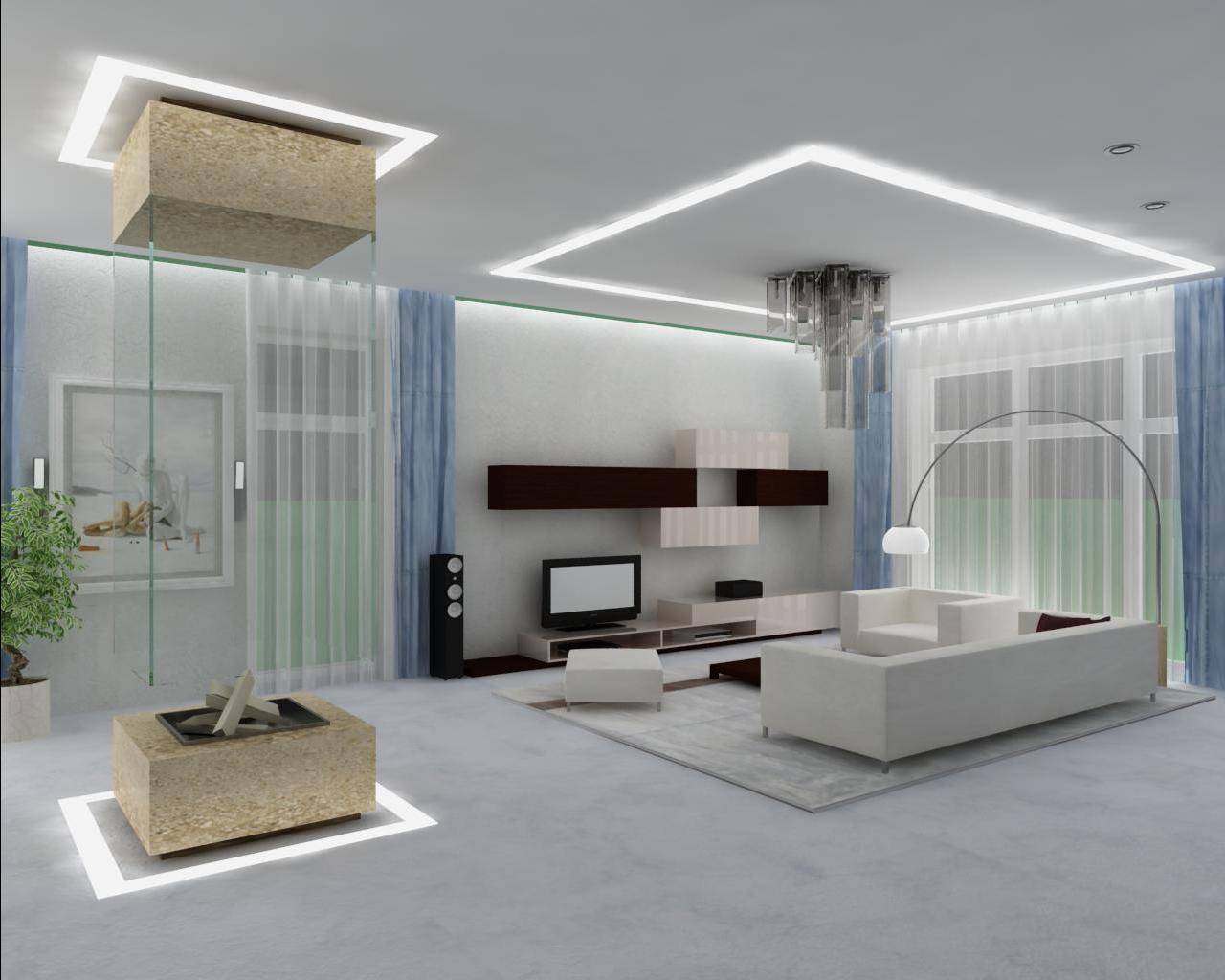 Потолок в стиле хай-тек может быть оформлен традиционным способом. Простая, гладкая однотонная поверхность станет отличным фоном для современных светильников. Другой вариант – монтирование подвесных потолков в сочетании с натяжными полотнами. Глянцевые или матовые потолки ПВХ в белых, серых и черных оттенках идеально подойдут для данного интерьерного стиля. Преимущество таких потолков в том, что они дают возможность спрятать провода для точечной подсветки или светодиодной ленты, которая сделает потолок волшебным.