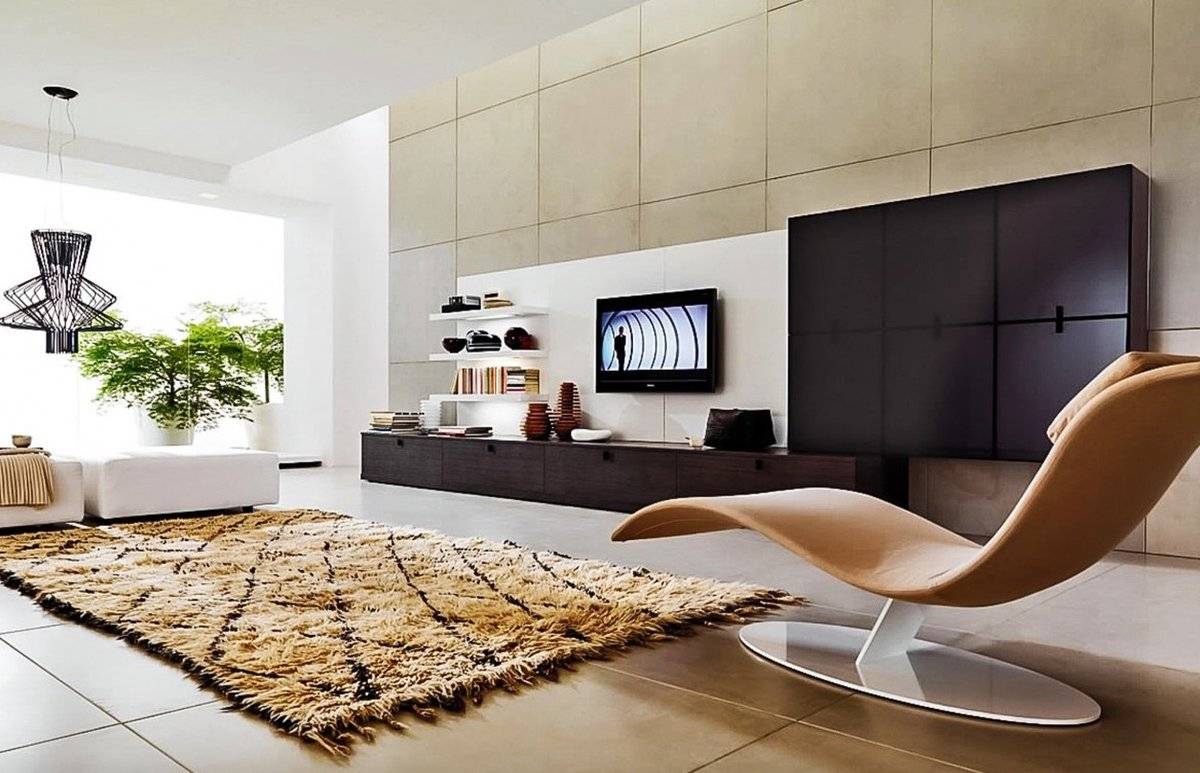 В царство хрома, пластика и стекла превосходно впишется глянцевое напольное покрытие. Это может быть однотонный кафель, керамогранит, виниловая плитка или ламинат. Отличный вариант для интерьера хай-тек – наливные полы, способные отражать свет и визуально увеличивать пространство комнаты. Замечательно смотрится имитация натурального камня с характерными прожилками и рисунками. Никаких принтов и орнаментов на полу быть не должно. Такое покрытие выглядит весьма презентабельным, но несколько неуютным. Чтобы сгладить это впечатление, достаточно дополнить композицию небольшим акцентным ковром с длинным ворсом. Полы, покрытые керамогранитом или кафелем, очень холодные, поэтому стоит оборудовать покрытие подогревом, установив систему «Теплый пол».