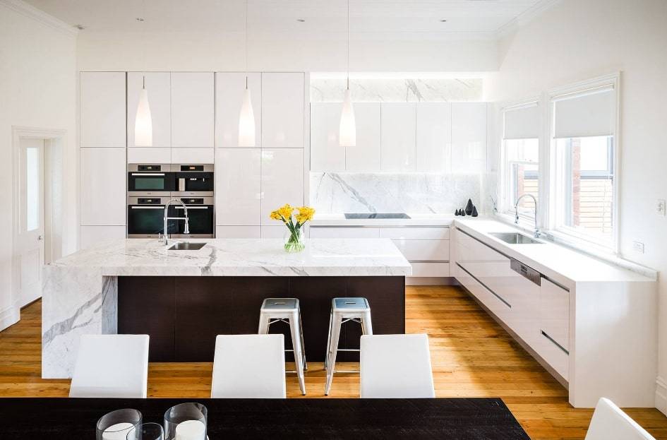Мебельный гарнитур можно сделать на заказ. Если позволяет место, предпочтителен гарнитур не прямой, а П или Г-образной формы — так пространство будет выглядеть более аккуратно. Мебель не обязательно должна быть глянцевой. Если в дизайне уже предусмотрен глянцевый потолок и лакированный ламинат (глазурованная плитка) на полу, для отражения света этого будет целиком достаточно.