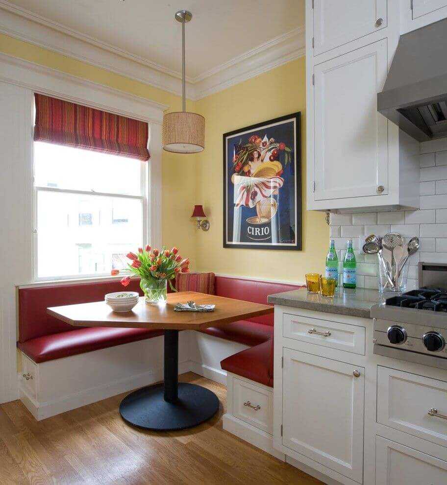 Также сэкономить место в небольшой столовой поможет скамья, хоть она и не слишком удобна для длительных и многолюдных застолий.