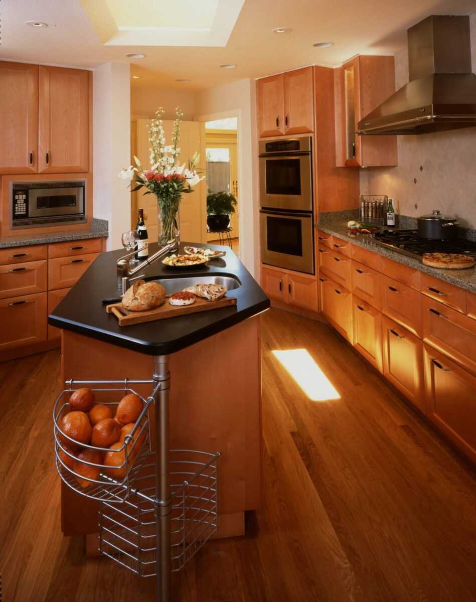 Вариантом размещения в таком помещении в центре станет остров, который может применяться в качестве рабочей поверхности. А обеденная зона будет перенесена в угол.