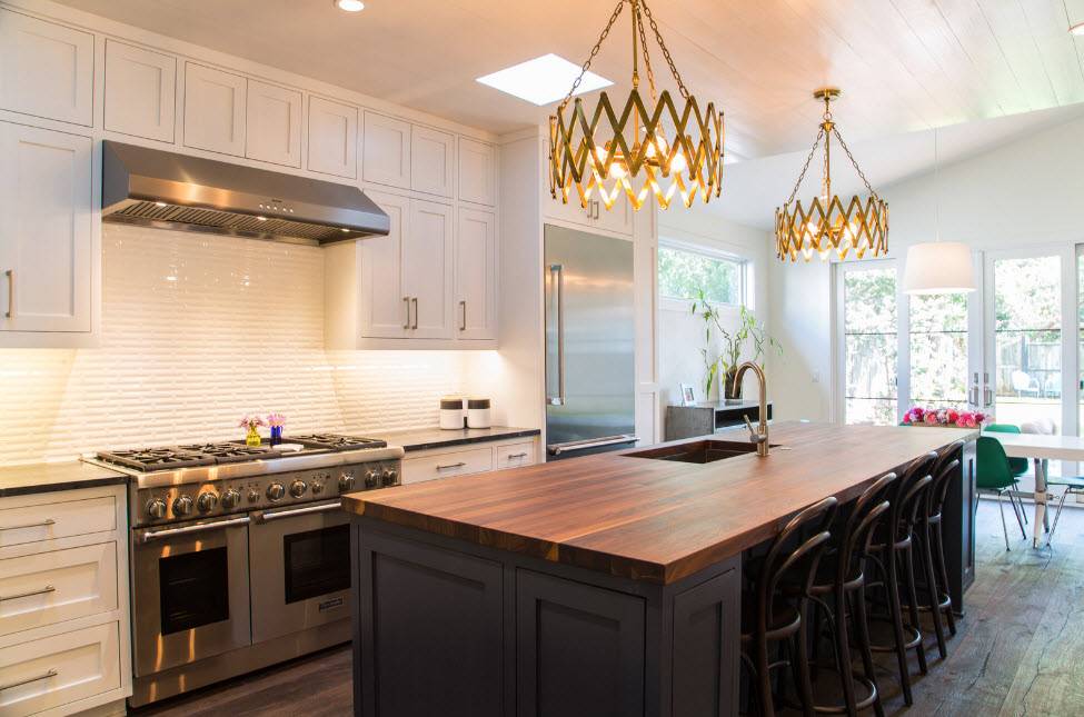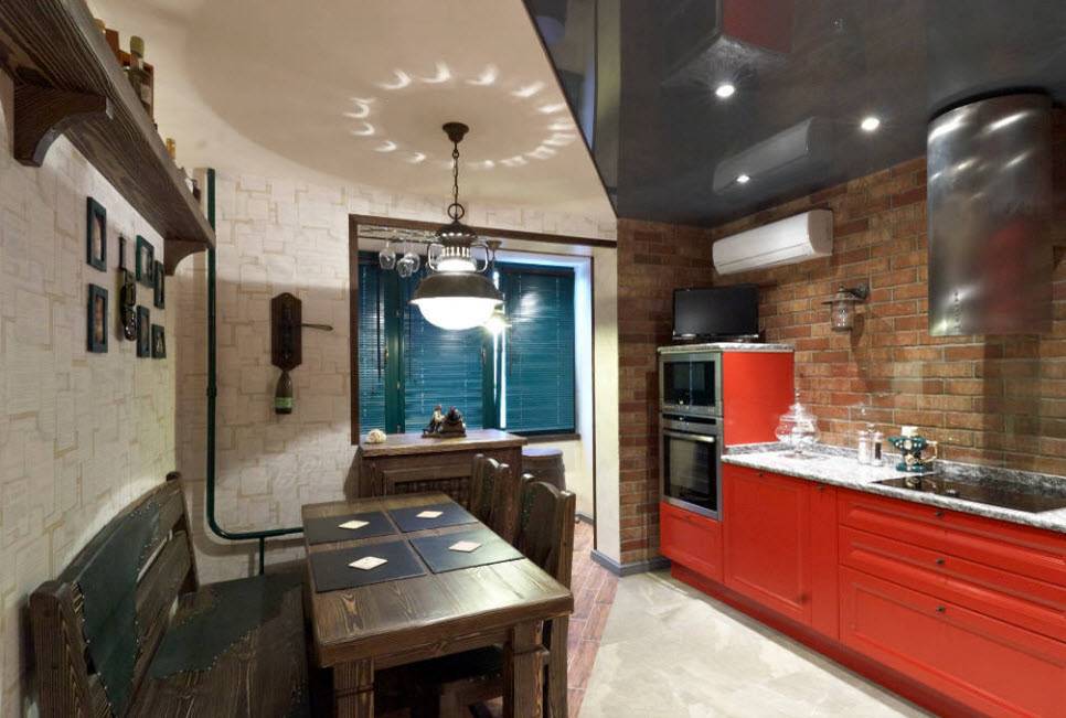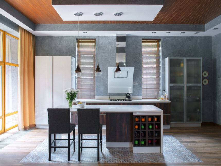 Обычно ремонт кухни в частном доме мало отличается от отделки городских квартир своими руками. Но если у вас деревянная постройка или коробка сложена из газобетонных блоков, могут возникнуть проблемы с креплением навесного оборудования. Так что лучше продумать, как снизить нагрузку на стены кухни. Здесь придется отказаться от встраиваемой мебели, а также свести к минимуму количество верхних модулей. Кроме того, дерево, как и легкая кладка, очень чувствительно к избыточной влажности воздуха. Чтобы не повредить несущие конструкции, обязательно используйте пароизоляцию под внутренней обшивкой кухни.
