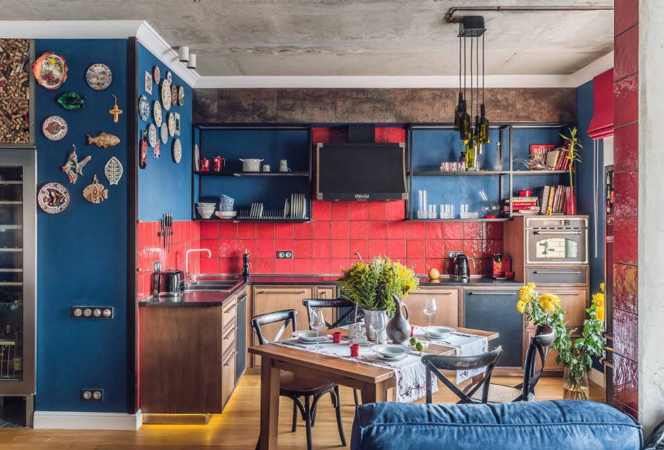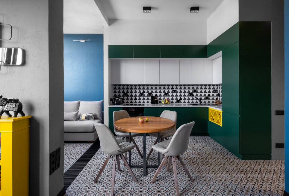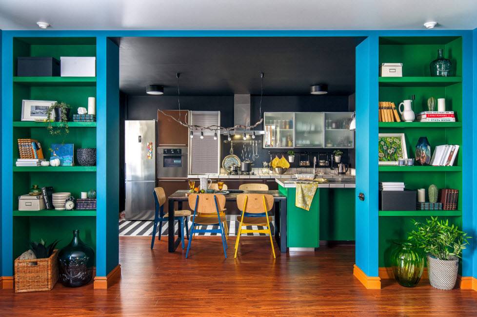 Именно поэтому дизайнеры рекомендуют сочетать не более трех ярких оттенков. Очень выгодно в плане зонирования работает окрашивание кухонной и гостиной зон в разные цвета. Ковровая дорожка, разные рисунки или цвета будут зрительно увеличивать помещение и одновременно разделять кухню и зону отдыха. Именно это является конечной целью ремонта.