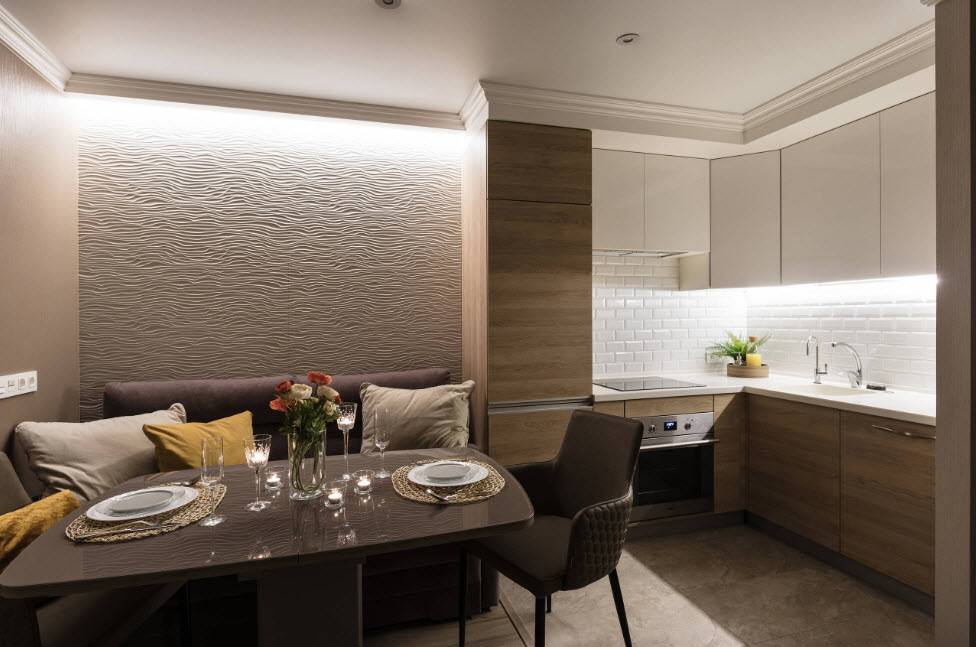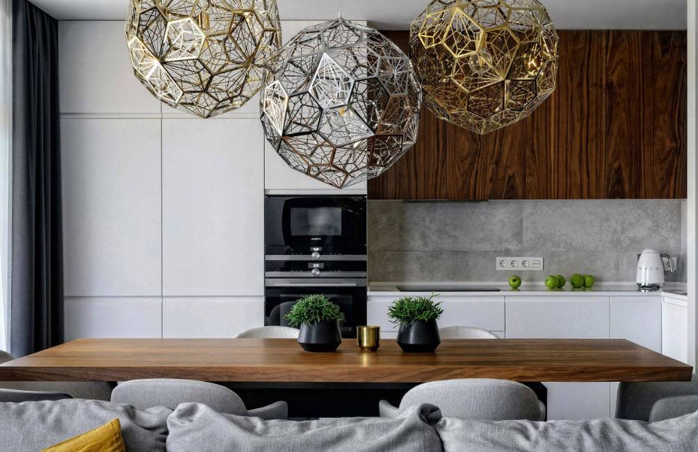 Удачный интерьер кухни-гостиной на 16 кв. м напрямую зависит от освещения. Именно с электрической проводки начинаются любые работы. Не жалея средств во время ремонта, можно значительно сэкономить на электроэнергии по его окончании. Студия должна быть хорошо освещенной в целом и зонально. Ламповые системы, люстры, точечные светильники по потолку будут освещать все пространство во время совместных семейных ужинов и угощения гостей. Настенные бра, лампы, электрические декоративные подсветки создадут уютную романтическую атмосферу во время отдыха в гостиной зоне. Яркие точечные светильники, расположенные по периметру подвесных шкафов и столешниц, помогут осветить нужный рабочий участок.