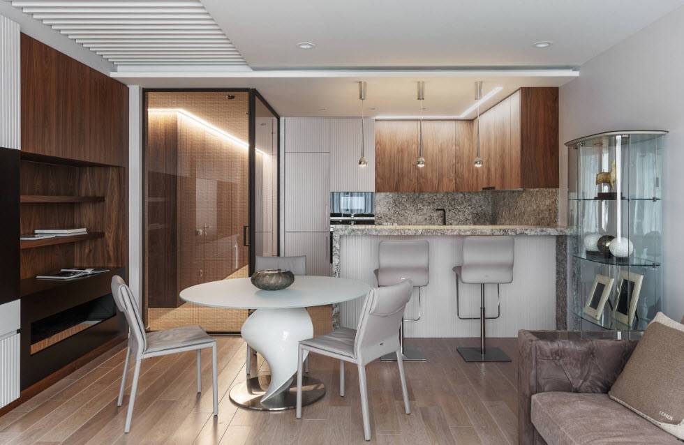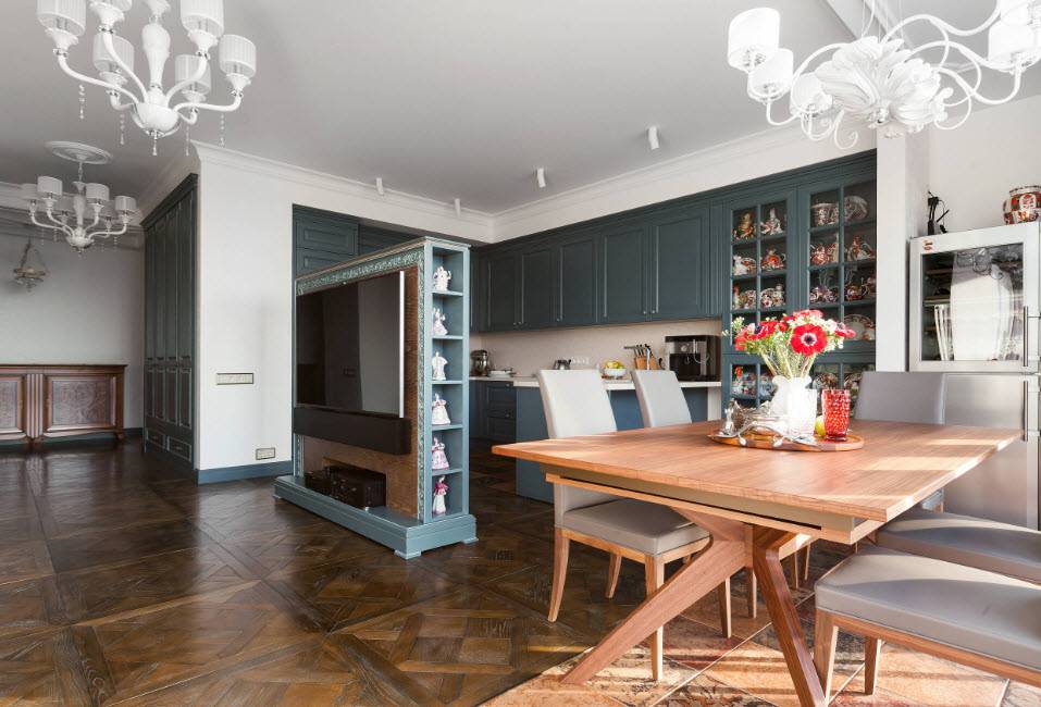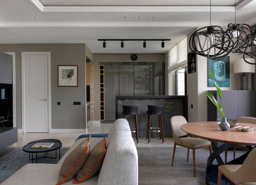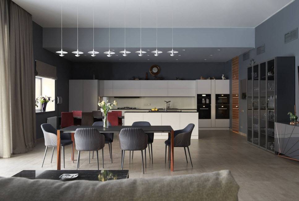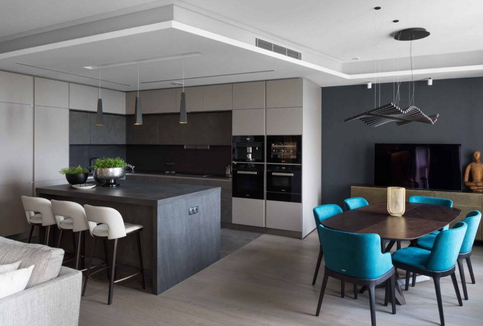 Деление помещения на зоны важно в современном интерьере. Всё чаще встречается кухня гостиная, совмещающая две функции — прием гостей и приготовление пищи