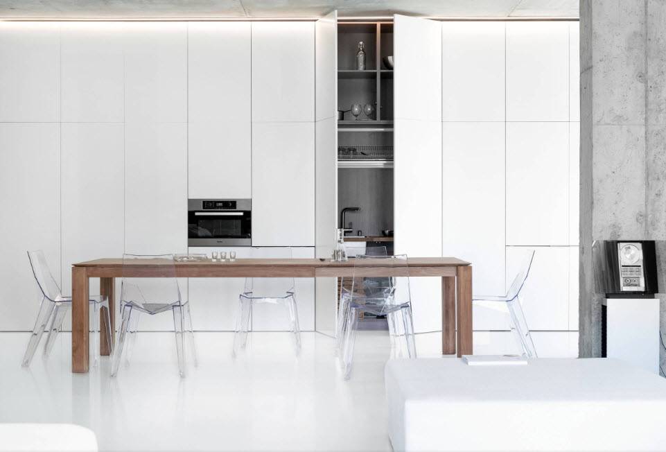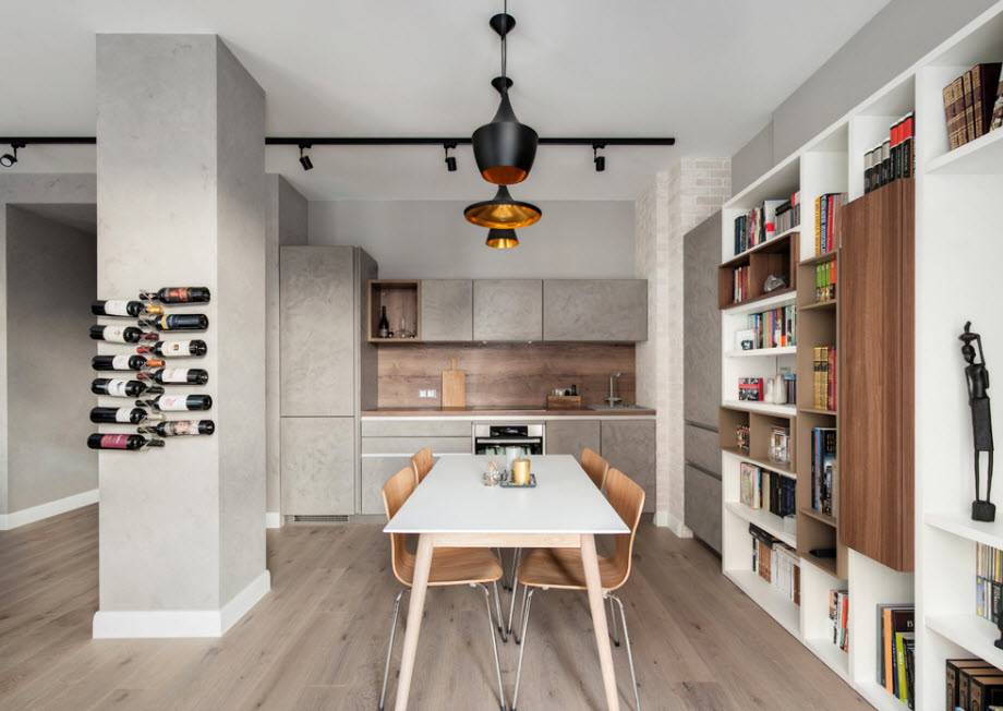 Дизайн больших студий не обходится без декоративных ширм, перегородок или стеллажей. Они могут быть изготовлены из стекла, гипсокартона, дерева или просто ткани. Для функциональности перегородку можно выбрать с нишами для аквариума, книг, ваз или посуды. Подобные конструкции станут настоящим украшением любого интерьера, сочетая в себе красоту и практичность. Раздвижные двери с роликовым механизмом позволят гостям не наблюдать за процессом приготовления пищи. Кроме того, благодаря этому в гостиную не будут проникать посторонние и не всегда приятные запахи.