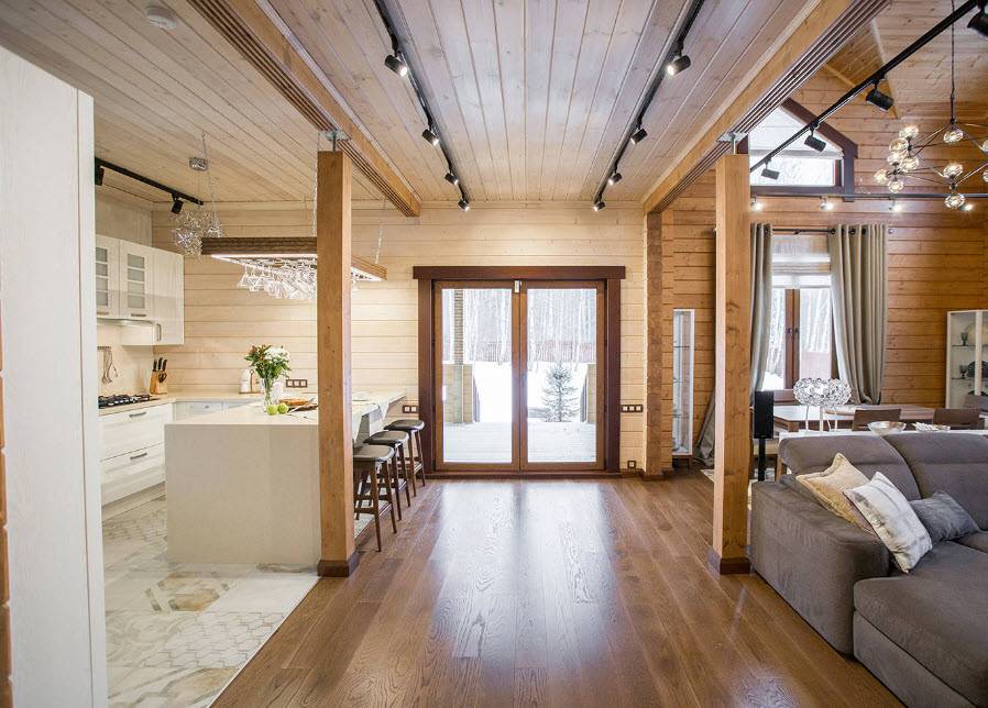 Если вы еще не определились, каким хотите видеть интерьер вашего деревянного дома, стоит посмотреть фотографии готовых интерьеров гостиных, кухонь и спален.