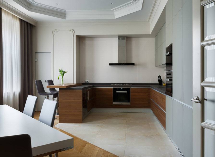 Если кухня совмещена с гостиной или столовой, то уместно будет сочетание дерева (в обеденной зоне) и керамической плитки (в рабочей зоне).