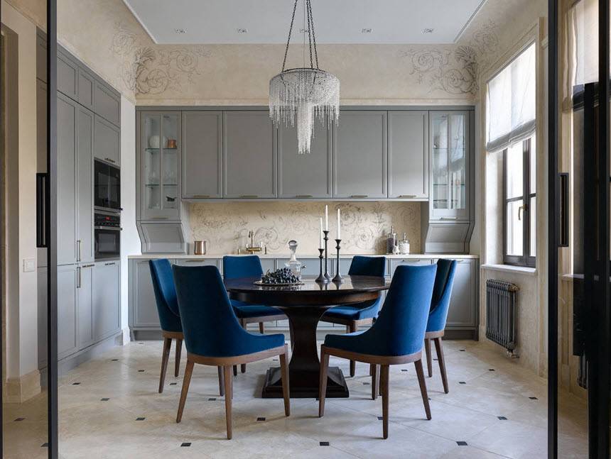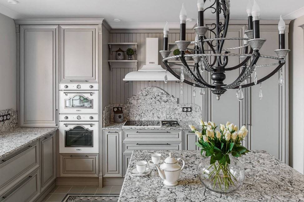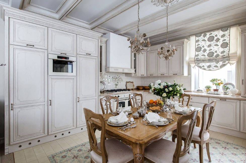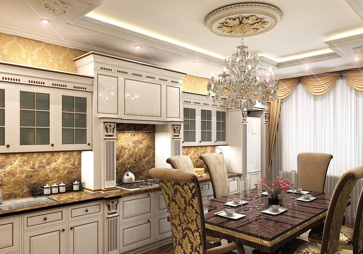 Для каменных и кирпичных особняков в классическом стиле уместна классическая и неоклассическая кухня. Каждая деталь интерьера подчеркивает статус и хороший вкус хозяев. Кухня всегда выполнена с островом в виде обеденного стола – это особенность, которую предполагает классический и неоклассический интерьер кухни в частном доме. Классическая кухня симметрична, пропорциональна, выполнена в светлых, пастельных тонах и декорирована золотом.