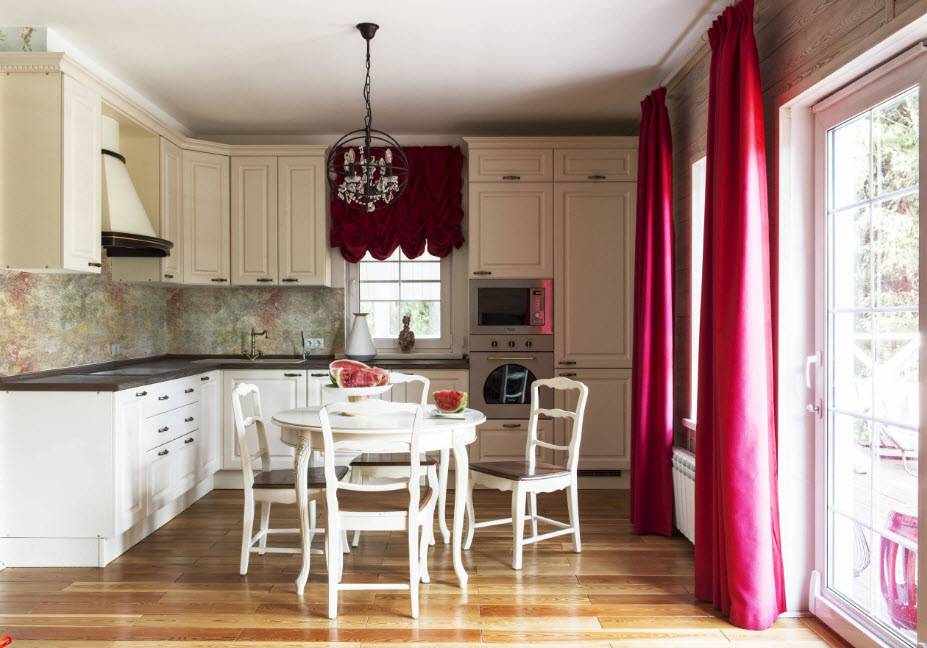 По канону пол в интерьере кухни в деревенском стиле отделан – натуральным камнем, деревянными досками или керамической плиткой. Первые два материала – доступны не каждому. Достойно заменить пол из массива сможет паркетная доска, которая за счет верхнего деревянного слоя не отличается от «оригинала», но стоит дешевле. Самые бюджетные альтернативы дереву – ламинат и более практичный линолеум «под дерево» — современные покрытия высоких классов прочности вполне приятно выглядят и долго служат. Камень можно заменить более доступным и практичным керамогранитом. Плитка подойдет однотонная естественных тонов, с традиционным узором либо классическая черно-белая (для прованса).