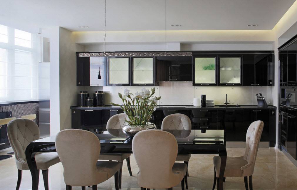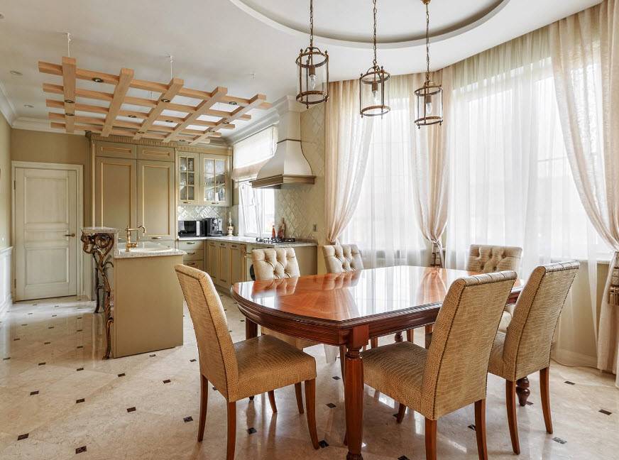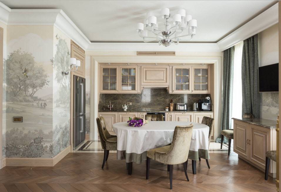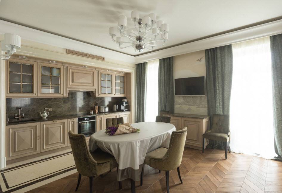 Классика – стиль, который неподвластен времени. Натуральная деревянная мебель, мраморный пол и столешницы, паркет и геометрия на стенах, бежевые тона и дорогой текстиль – все это позволит создать роскошную обстановку, демонстрирующую финансовый успех домовладельца. Сделать помещение максимально помпезным позволит рояль, расположенный в столовой зоне.