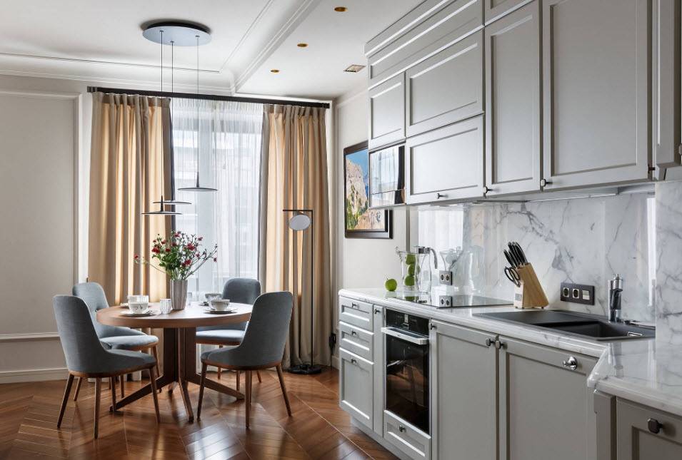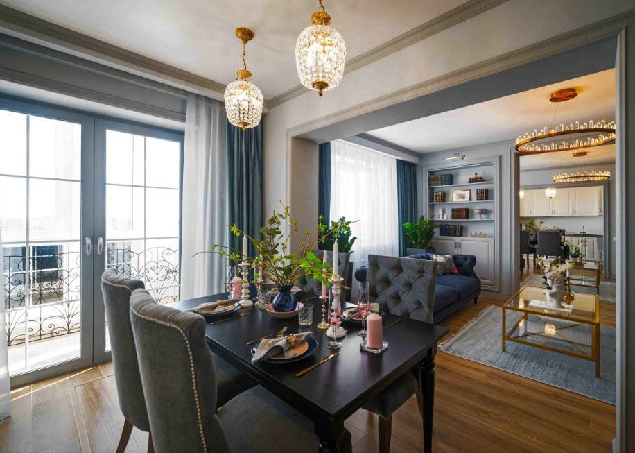 Неоклассика. Если классические мотивы пришлись по душе, но смущает их избыточность и массивность, то в оформление пространства можно внести современность. К примеру, вместо штор используют жалюзи, паркет заменяют ламинатом, а вместо роскошных люстр устанавливают современные светодиодные светильники.