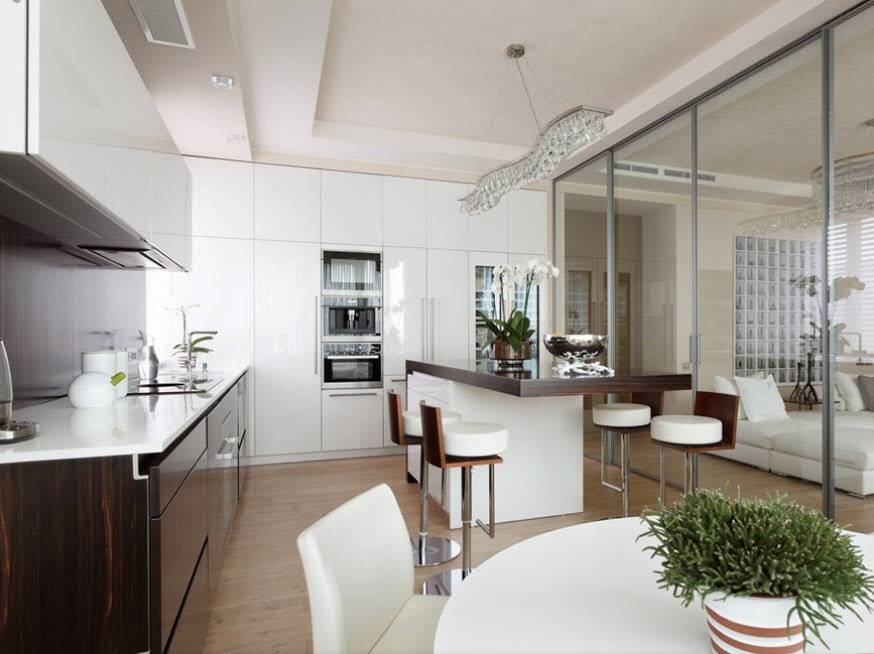 Барная стойка – самый распространенный и удобный вариант разделения пространства. Она одновременно является местом для легкого перекуса и рабочей столешницей. Очень удобным решением будет оснастить барную стойку дополнительными вертикальными полками для хранения овощей, фруктов и конфет, вращающимися вокруг своей оси. Единственный минус – это высота конструкции. Пожилым людям доставляет неудобство взбираться на высокие стулья, а малыши попросту не смогут дотянуться до стола.
