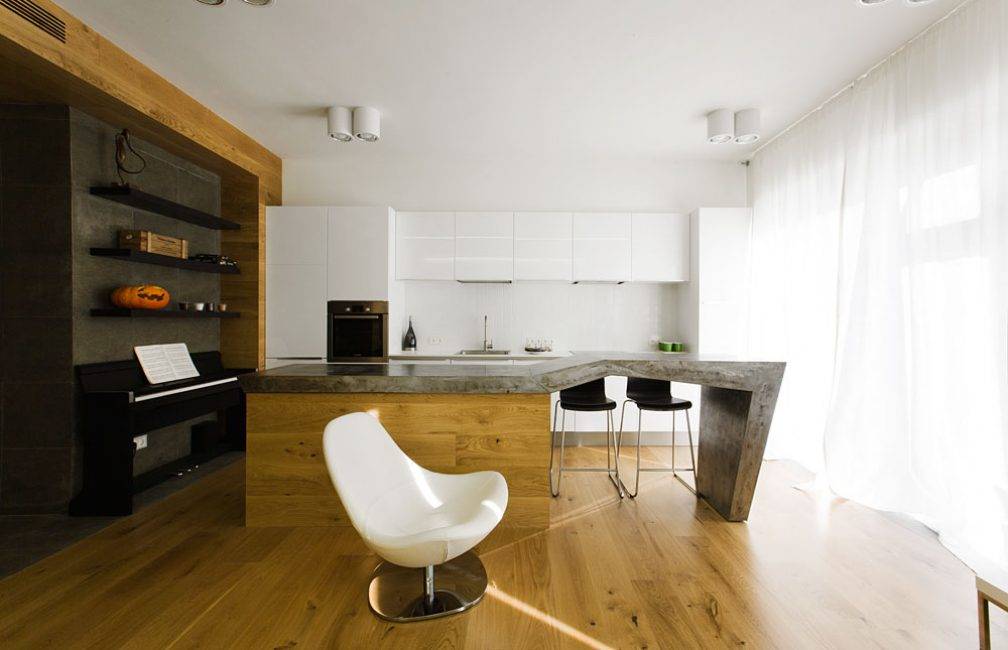 - Барная стойка, которая выполняет и функцию стола. С этой же целью можно использовать рабочую поверхность. Обеденный стол со стульями принято размещать в гостиной, столовой.