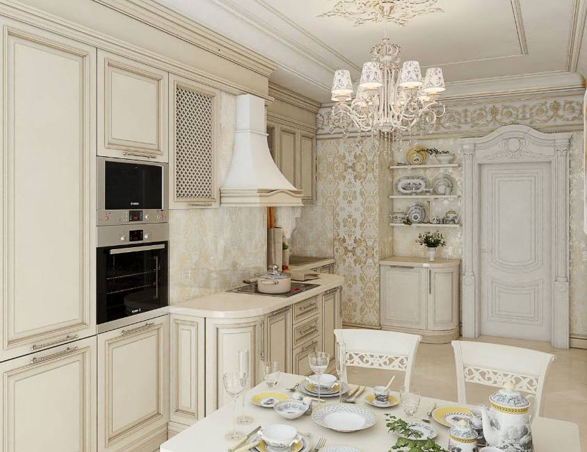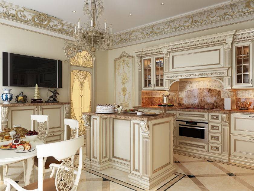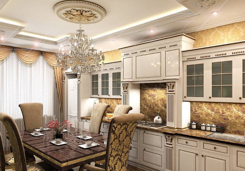 В оформлении классической кухни дизайнеры используют деревянные панели, текстильные обои, паркет, ламинат, керамоплитку. Столешницы из мрамора и гранита, двери с витражными стеклами, белый потолок с лепниной или натяжной потолок под роспись.