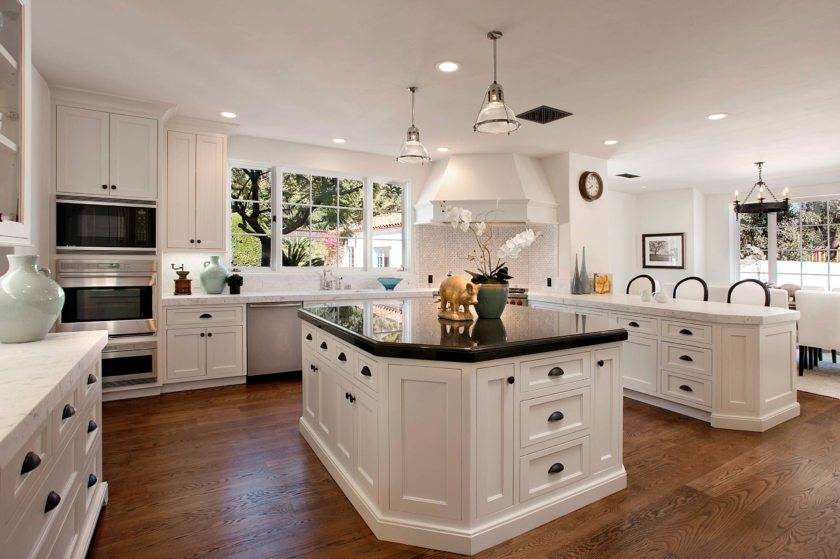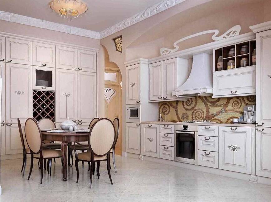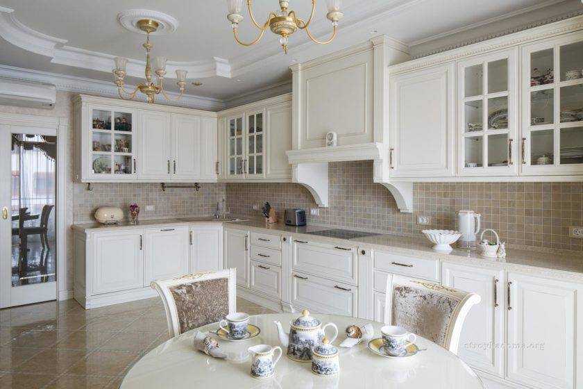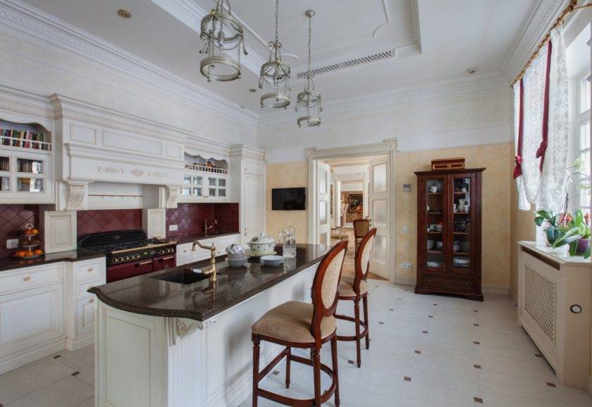 Неоклассика – наилучший дизайн для просторной проходной или совмещенной кухни частного дома. Главные требования этого стиля – большая площадь и высокие потолки.