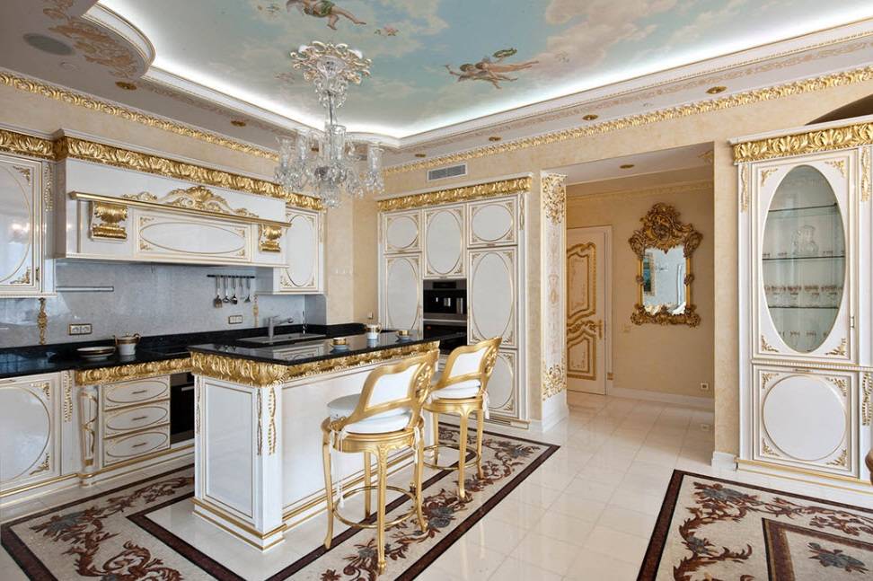 Потолок кухни, оформленной в классическом стиле, должен быть максимально высоким. Если речь идет о частном доме, то высота потолков учитывается еще при строительстве жилья, а вот в квартире приходится мириться с реальностью. Визуально приподнять потолки можно двухуровневыми гипсокартонными конструкциями, глянцевым натяжным полотном. А вот при высоких потолках допускается декор, среди которого лепнина, громоздкие люстры.