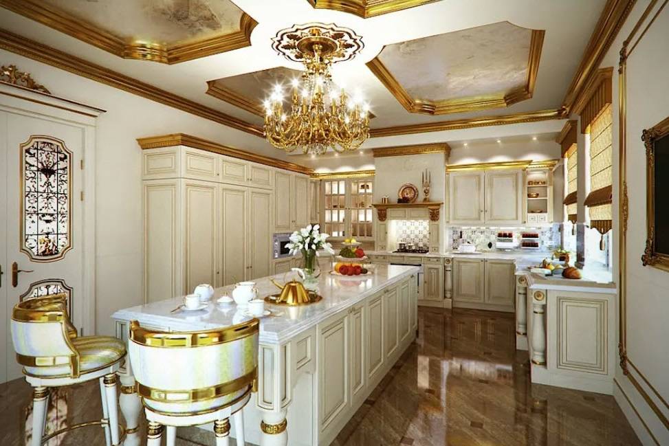 Обилие золота, излучающего тепло – это неплохое решение для кухни, оформленной в классическом стиле. Подчеркнуть благородный блеск золота можно при помощи белого или коричневого цвета. Что касается самого золота, то оно себя может найти в фурнитуре, рамках зеркал или картин, багетах на потолок. Не менее красиво выглядит деревянная мебель, дополненная золотистыми узорами.