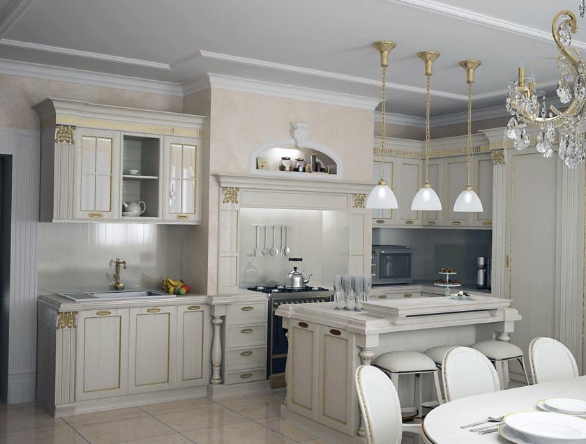 Классический стиль можно встретить и в городской квартире, но намного чаще он встречается в частных домах, где кухня объединена со столовой и гостиной. Чтобы создать легкую и свободную атмосферу на такой традиционной кухне, используется бело-золотая гамма.
