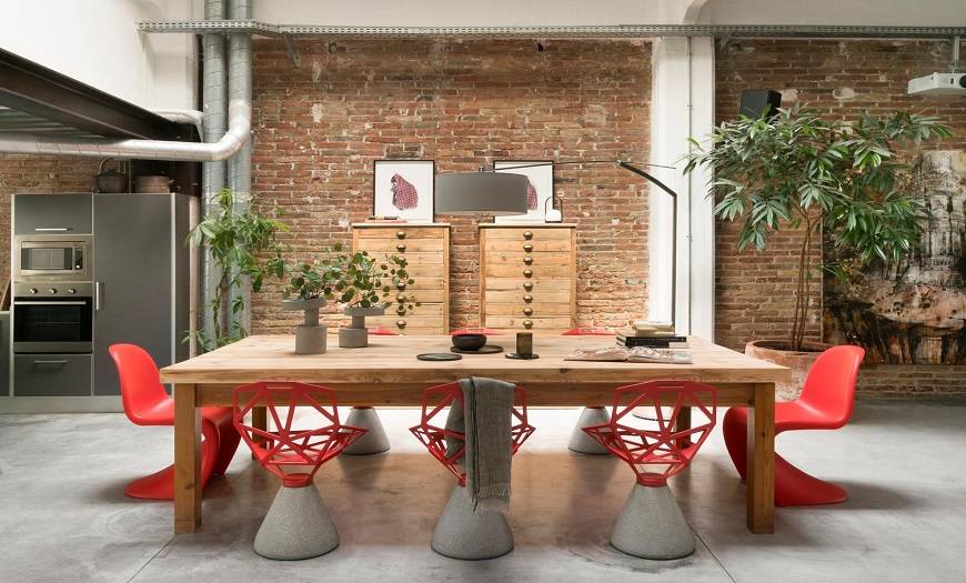 В этом стиле оформлялись целые этажи практически без перегородок, так что в результате получалось единое пространство, поделенное на зоны – столовую, зону готовки, отдыха, развлечений и сна.