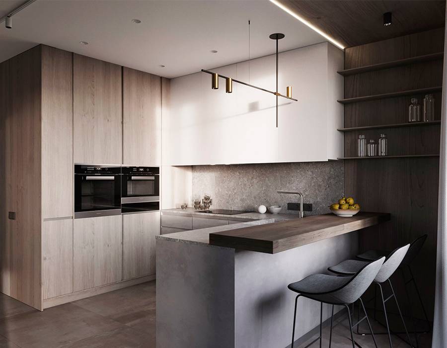 В просторной кухне с высоким потолком будет эффектно смотреться остров или п-образный гарнитур. Такой гарнитур имеет барную стойку с высокими табуретами. Рабочая зона должна отличаться гладкостью и простотой. Для ее дизайна выбирают древесину, металл или стекло, а также оформляют при помощи хромированных элементов в виде полочек, крючков или окантовки.