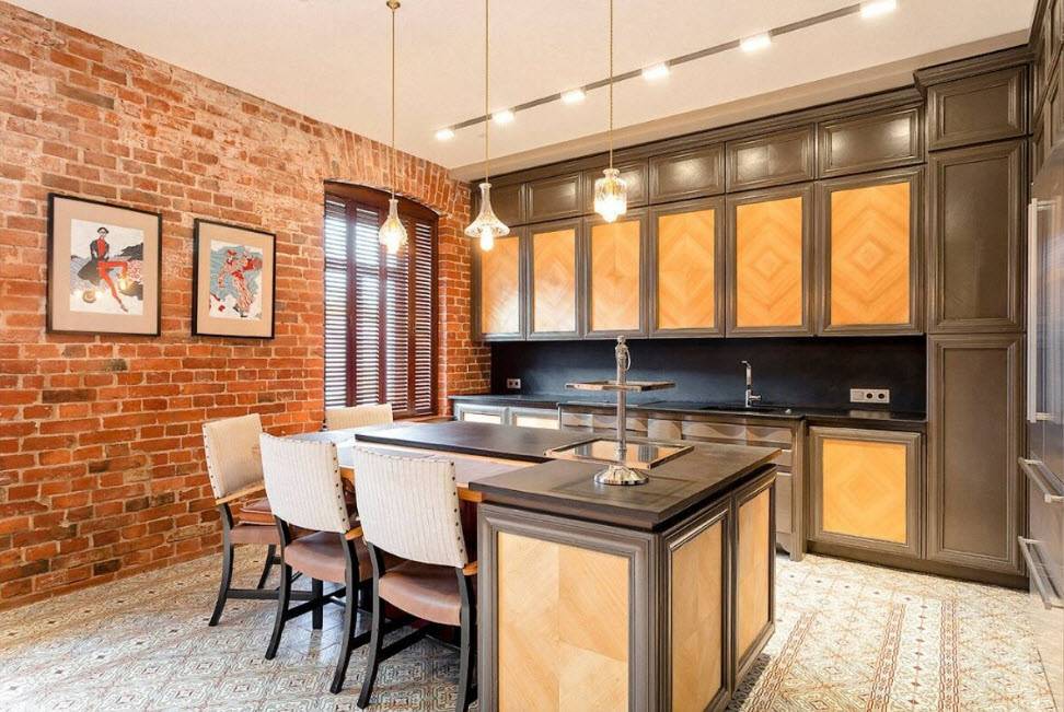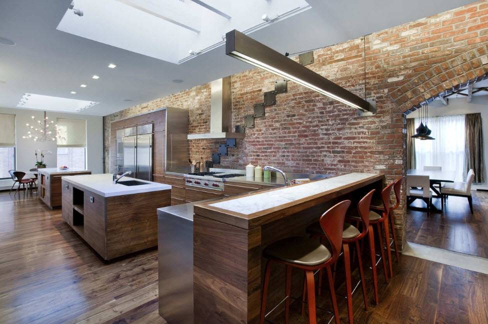 - Обилие металла, стекла и дерева, неотъемлемым элементом интерьера служит кирпичная стена.
