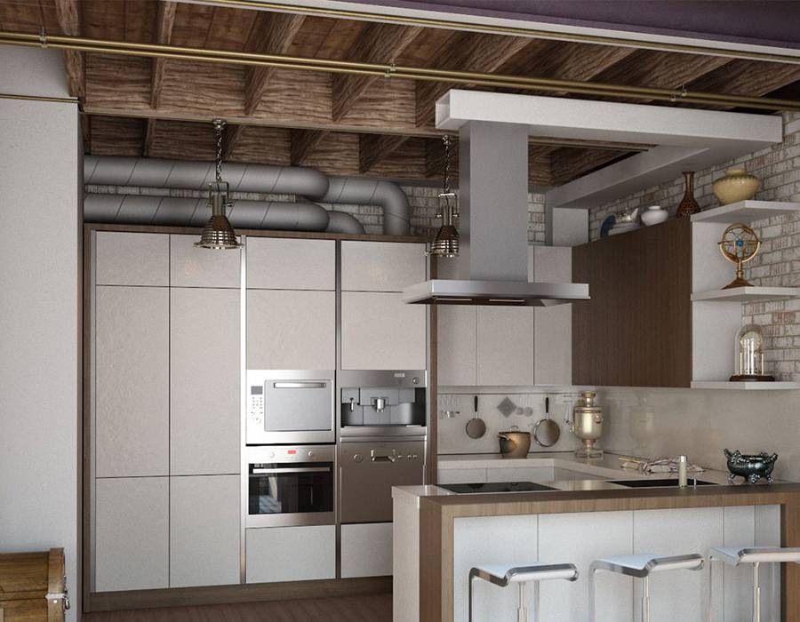 Популярность «чердачного» стиля привела к тому, что в этом направлении стали работать с типовыми кухнями, в том числе малых размеров. Естественно, это породило некоторые противоречия, ведь классический лофт требует высоких потолков, обширного пространства и других особенностей.