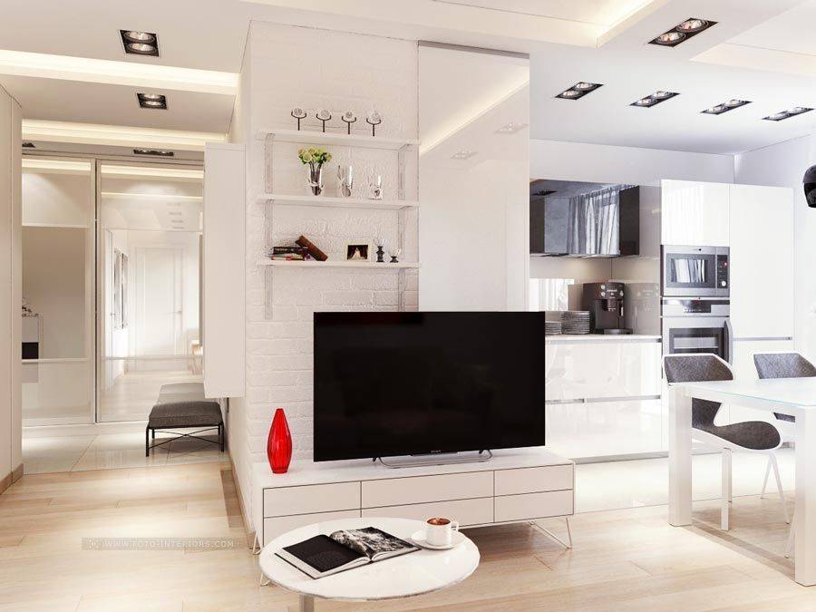 При разработке дизайна, основой которого станут светлые тона, можно в полной мере использовать все самые современные тенденции оформления помещений. Если речь идёт о квартире-студии, важным моментом будет зонирование. Чтобы визуально отделить гостиную от кухни, можно использовать полочку или консоль. Индивидуальность квартире придадут элементы интерьера модных цветов, к примеру, бирюзового или апельсинового. Если хозяевам захочется каких-то перемен в обстановке, достаточно будет сменить текстиль или декор, и дизайн заиграет новыми красками.