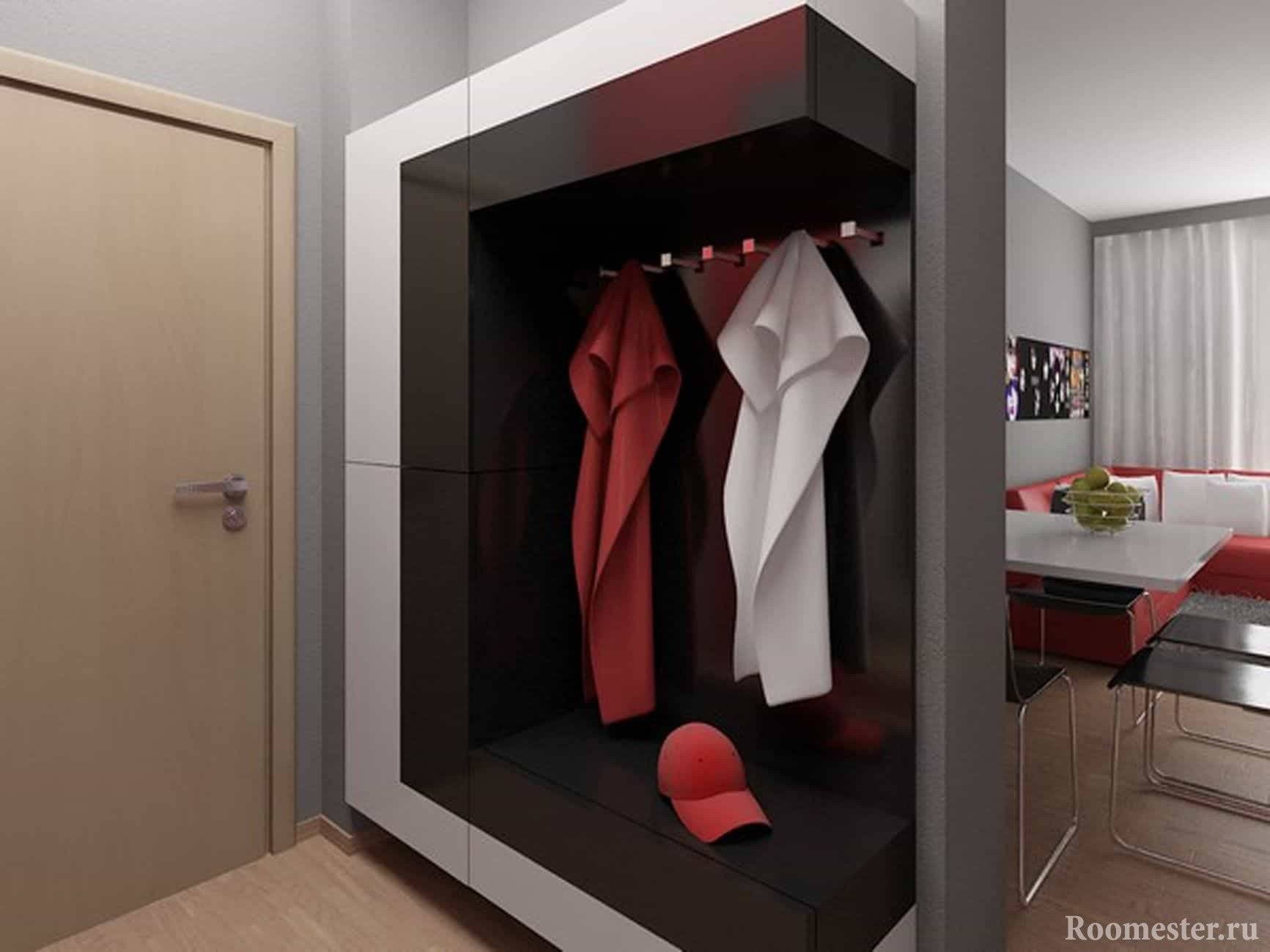 - Следующий шаг — верхняя одежда. Вешалка или шкаф располагают уже немного глубже.