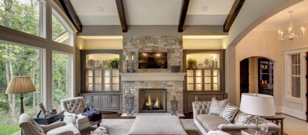 Если вы решили создать интерьер в стиле кантри, рассмотрите возможность установки в комнате камина. Для жителей многоэтажных домов выходом из ситуации станет имитация настоящего источника тепла, декорированная искусственным камнем. В частных домах уместно будет наличие деревянных балок под потолком, отделки из деревянных панелей.