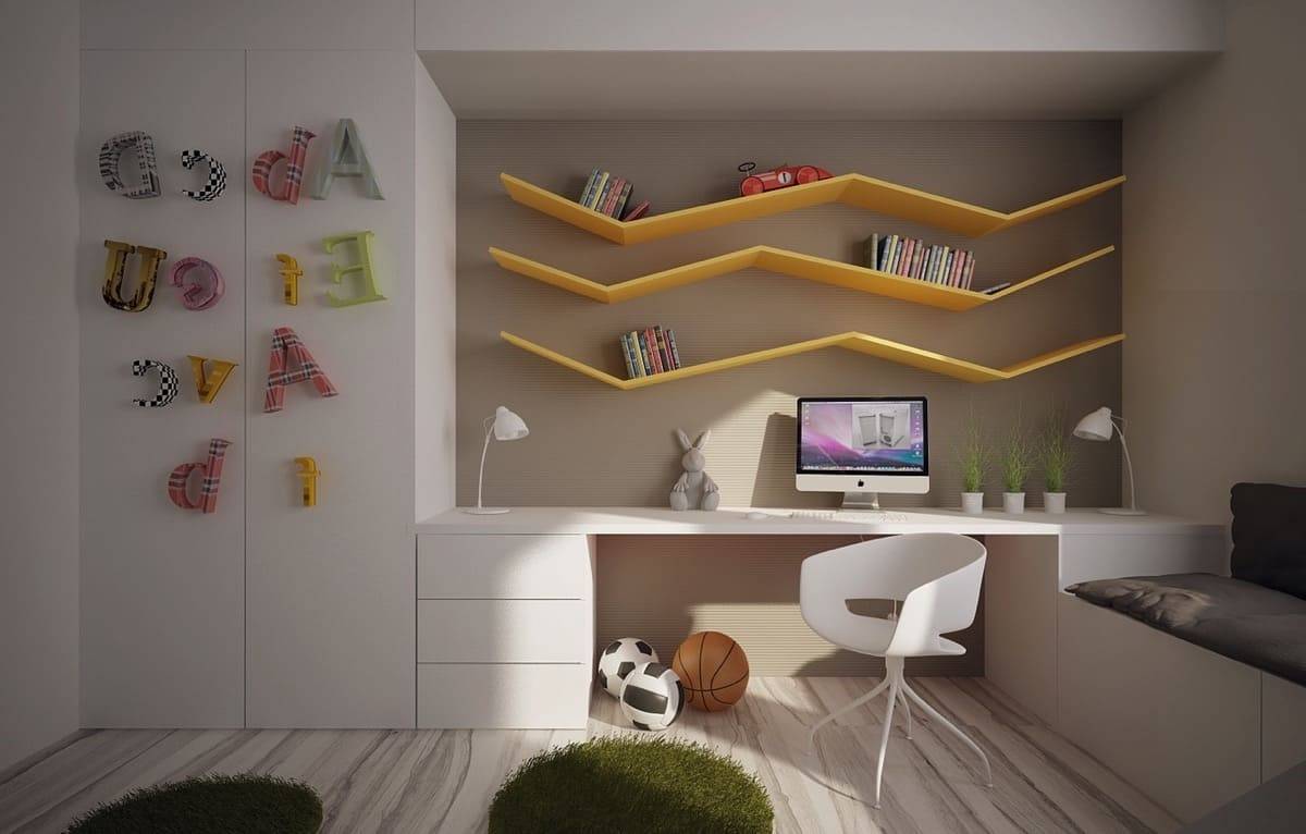 После расстановки стола и кровати, оставшееся пространство можно заполнить открытыми стеллажами, где ребенок будет хранить игрушки. Для мальчика и для девочки, которые уже не играют в игрушки, стеллажи, можно использовать для хранения книг, личных вещей, фотографий, подделок, сделанных своими руками.