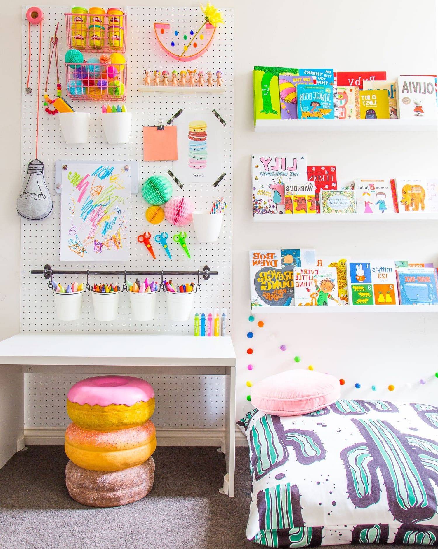 Яркие книги, на красивых и модных книжных полках отлично подходят для модного интерьера детской комнаты 2021