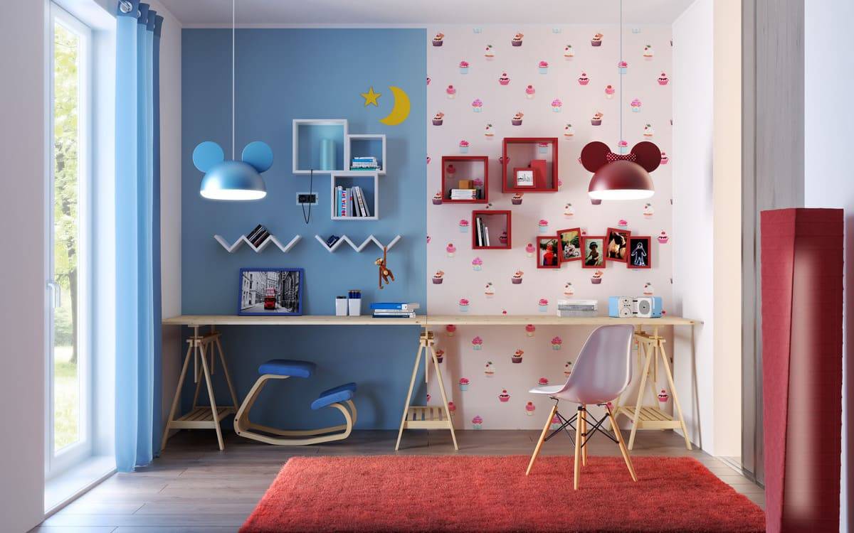 Если помещение организовывается для двух детей школьного возраста, важно, правильно расположить письменный стол, за которым ученики будут заниматься уроками и творческой работой. Наиболее практичный вариант – поставить стол возле окна