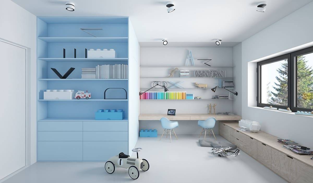 - освещение. Подсветка определенных участков и сокрытие благодаря затемнению наиболее загроможденных частей позволит не только расширить пространство, но и отделить зоны младших членов семьи друг от друга.