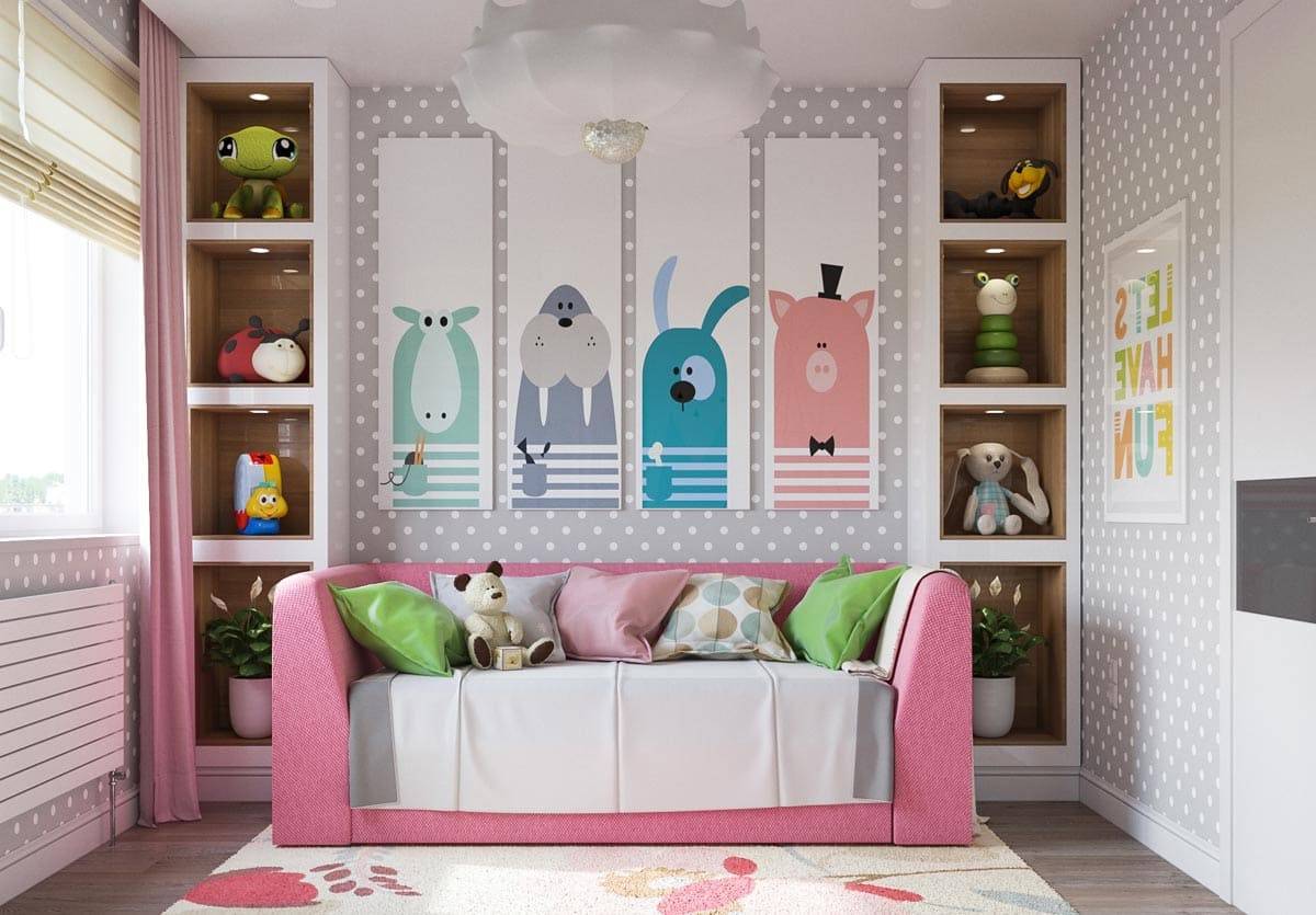 Хорошими решениями в комнате для девочки будут комбинации светло-зелёного и песочного, мягкого сиреневого с серой палитрой, зелёного с розовым.