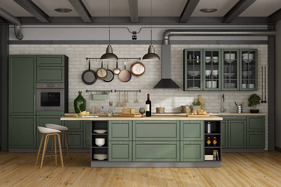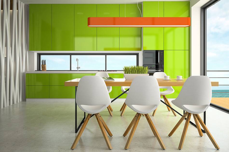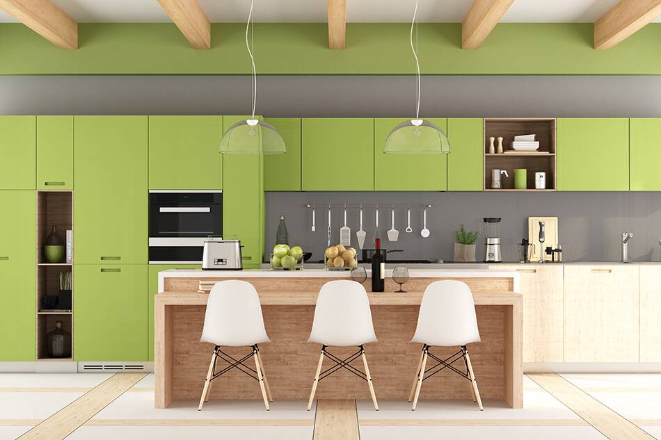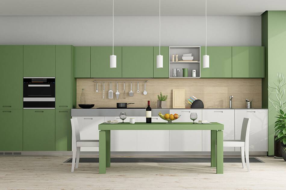 Зелёный – очень удачный вариант для кухни. Он свежий и близкий к природе, создаёт атмосферу гармонии и спокойствия. Так как зелёный является ненавязчивым, в оформлении его можно использовать в больших количествах. Вдохновитесь примерами: