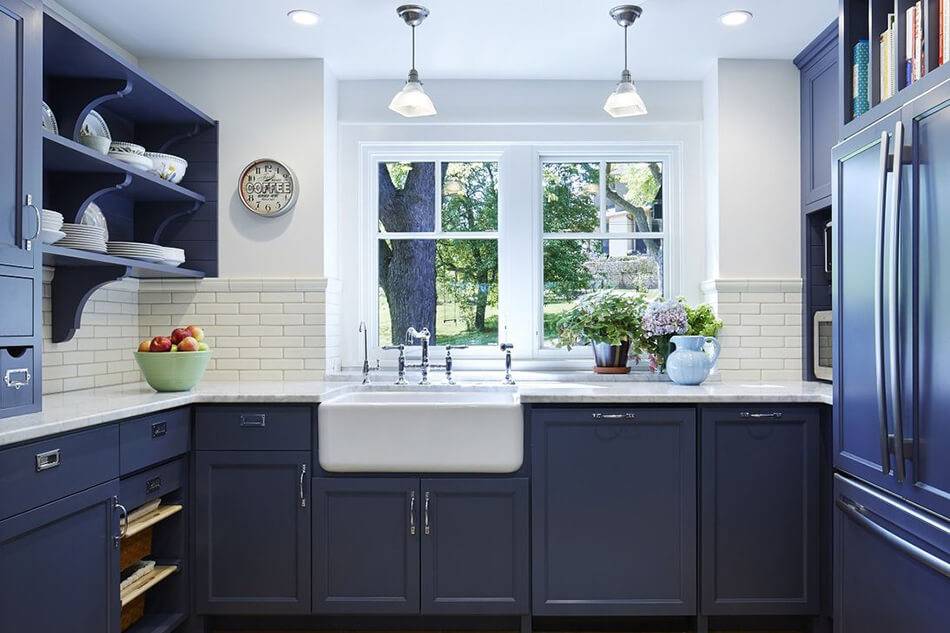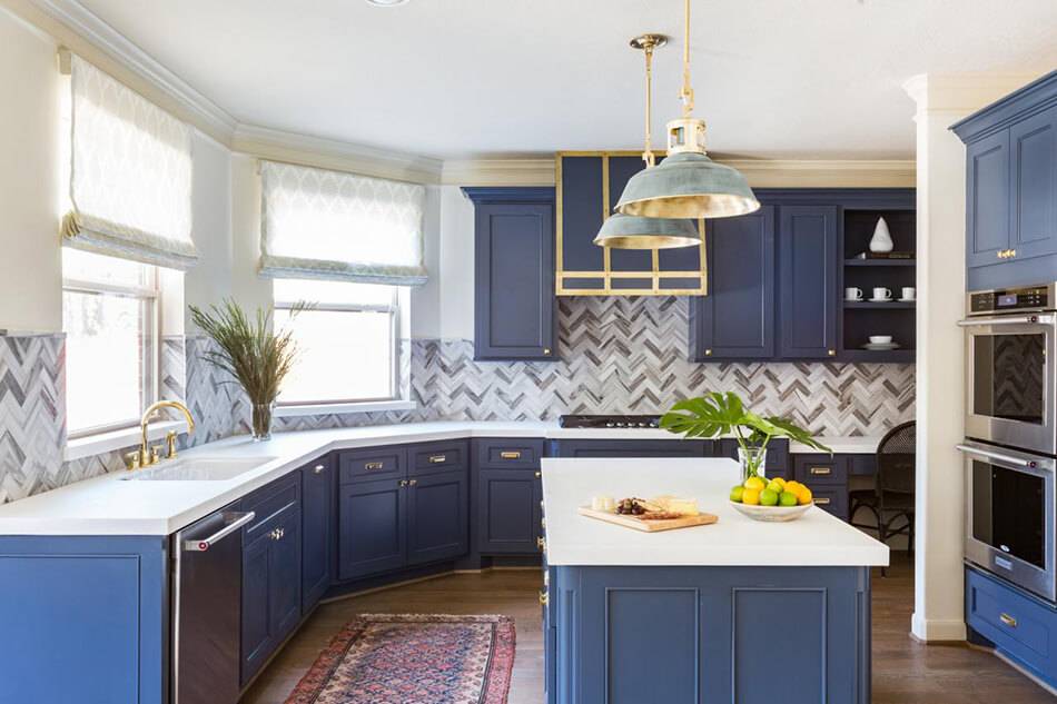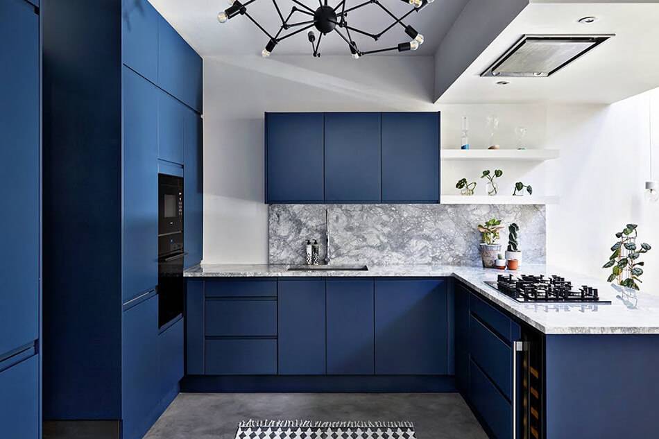 Синий – насыщенный и благородный цвет, который прекрасно подойдёт для оформления кухни. Однако стоит иметь в виду, что он утяжеляет предметы и имеет холодную температуру. Стоит использовать синий в просторных комнатах с окнами на юг, либо только в качестве акцента. Примеры красивых кухонь в синем цвете: