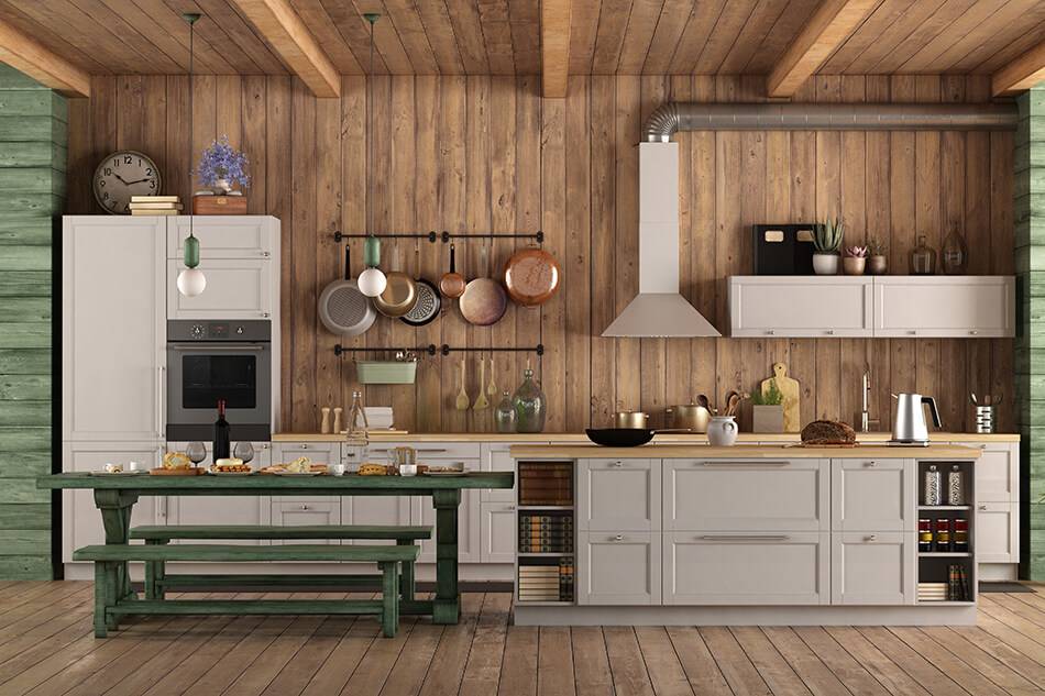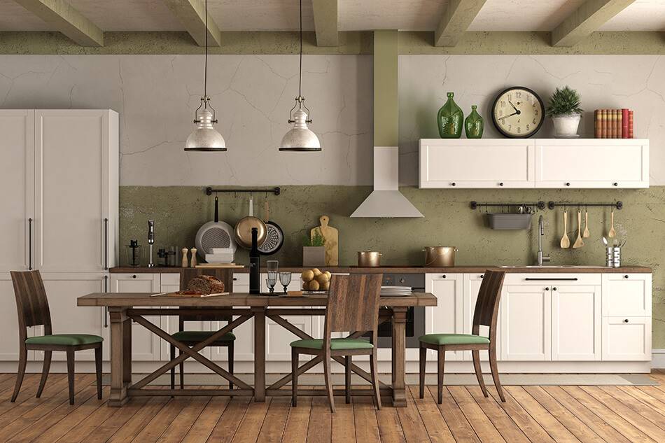 Жизнерадостные оттенки весенней листвы создадут на кухне уютную и умиротворяющую атмосферу. Зеленый цвет идеально дополняется коричневым и серым, а особенно — рисунком натуральной древесины.