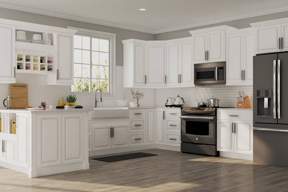 Полностью белоснежная кухня всегда будет выглядеть чистой и аккуратной. Чтобы сделать ее по-домашнему уютной, можно добавить деревянных текстур, а серые дополнения помогут облегчить процесс уборки.