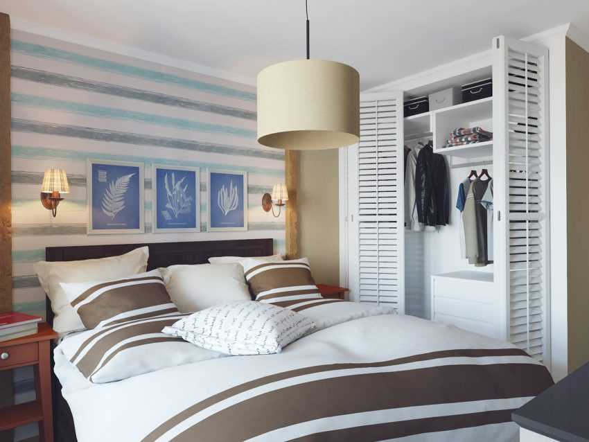 С особой тщательностью следует подойти к выбору платяного шкафа, который будет расположен в этом помещении. Разумеется, идеальным выбором здесь станет встроенный шкаф-купе, расположенный вдоль торцевой стены. Однако, традиционный дизайн спальни в хрущевке предполагает размещение именно в этом месте изголовья кровати.