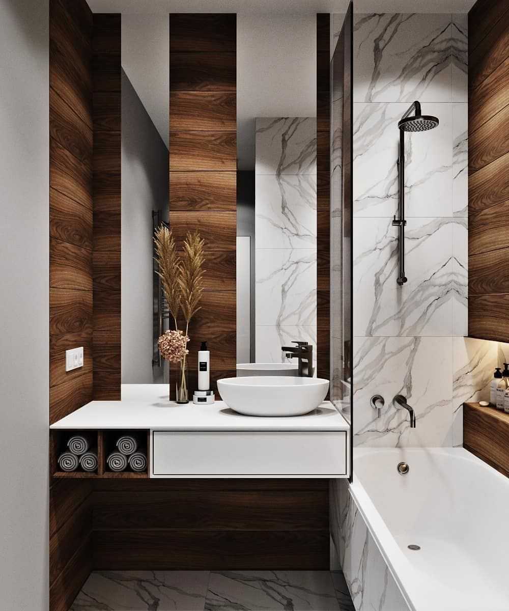 Сбалансированное дизайнерское решение даст вам возможность не только следовать трендам 2022 года, но и разместить в небольшой ванной всю задуманную сантехнику, а возможно и бытовую технику.