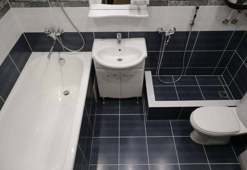 В таком помещении эстетично смотрится ширма, отделяющая ванну от унитаза. Однако в очень маленьком помещении нет возможности установить перегородку, поэтому можно воспользоваться визуальными средствами, например, возле ванны и унитаза выложить плитку разного оттенка.