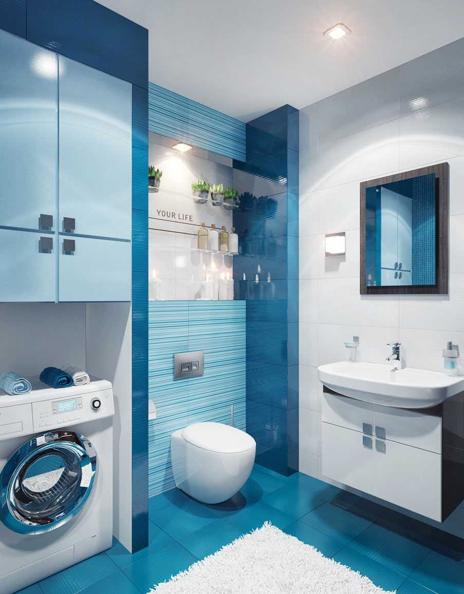 Во втором варианте места в комнате совсем мало. В таких случаях стиральную машинку устанавливают под раковиной, а над ней зеркальный шкафчик (он не съест много места, в нем можно будет хранить все необходимое, и при этом не нужно устанавливать зеркало).