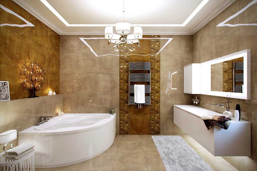 Ванну обычно помещают в углу комнаты, исключение делается для просторных помещений.
