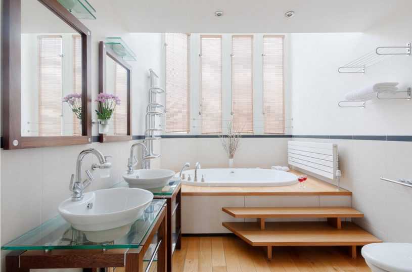 Хотелось бы применить и натуральное цельное дерево в дизайне интерьера, но делать это не рекомендуется. Оно выглядит красиво, но рассчитана такая мебель для ванных на большие помещения с хорошей вентиляцией.