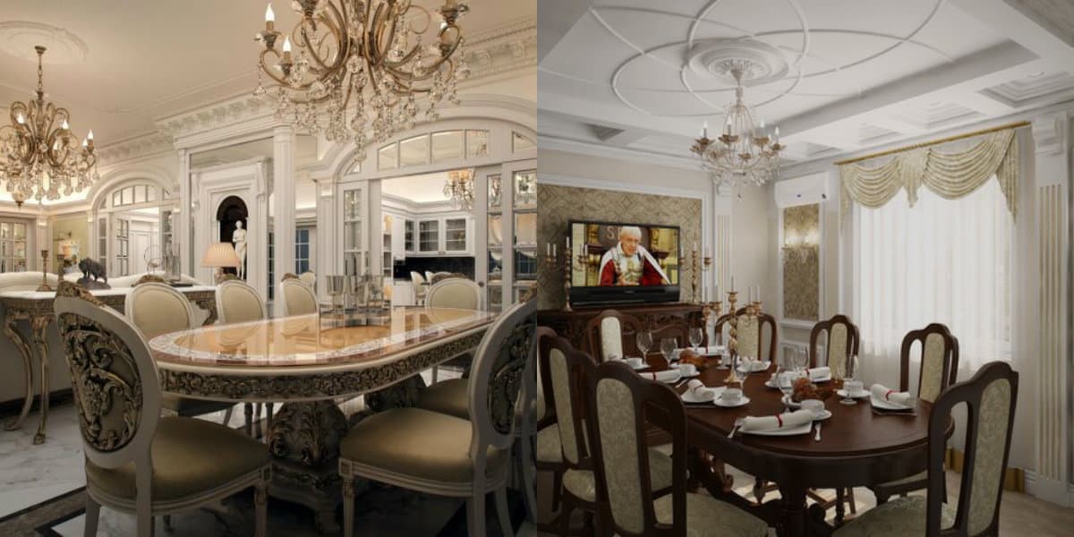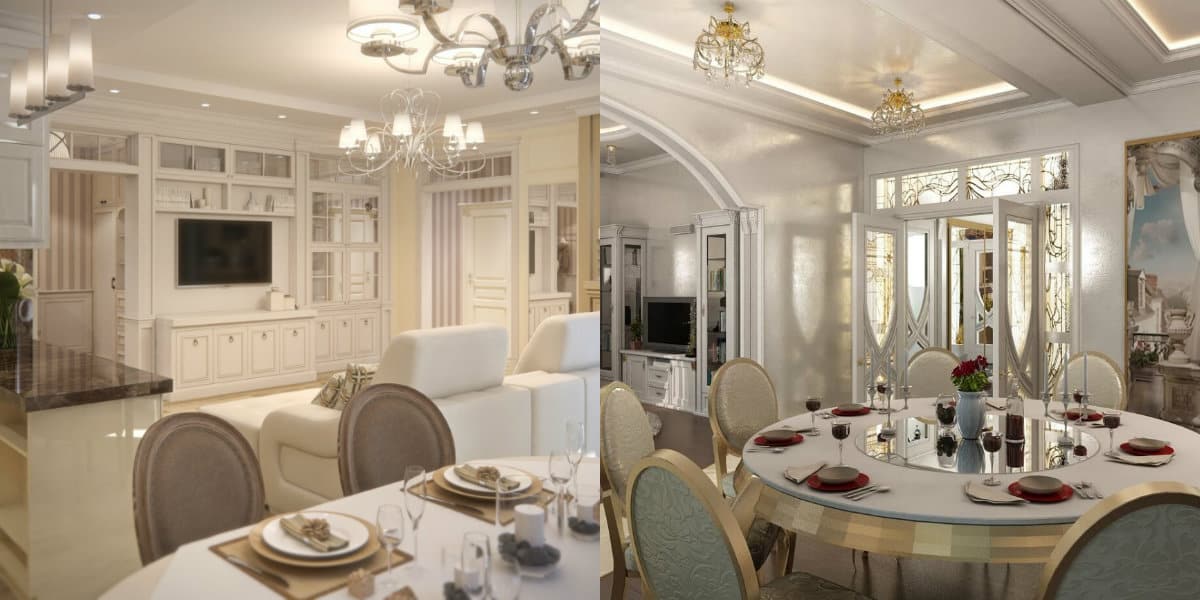 В классическом стиле интерьерная композиция смотрится по-королевски великолепно и шикарно. Это направление не приемлет дешевизны, имитации или практичности. Классика всегда стремится к роскоши, которая нарочно выставляется напоказ. Стены оклеивают обоями, богато изукрашенными растительным орнаментом. В цветовой гамме превалирует белый, коричневый и его оттенки. В больших помещениях устанавливают массивный, вытянутый стол со скругленными углами из древесины драгоценных пород. В комплекте к нему прилагаются изящные стулья на витых, изогнутых ножках. Они обиты мягким бархатом или иным дорогим текстилем. В цветах выбирают глубокие благородные тона или же аккуратные рисунки на золотом, шоколадном, бронзовом фоне. Декорирование стен ограничивается развешиванием портретов в багетных рамках или же пейзажных картин. Потолок богато украшают лепниной, а в его центре устанавливают многоярусную, тяжелую люстру из хрусталя. Дверной проем декорируют полноценными колоннами или пилястрами.