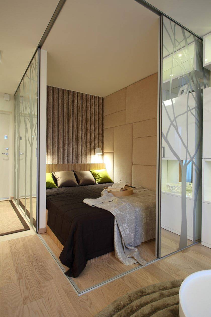 Вместо больших громоздких шкафов, которые занимают много места, используйте шкаф купе, который можно приобрести в магазине, или сделать под заказ. Рекомендуется использовать стеклянные двери, чтобы комната визуально стала больше. При высоте квартиры от 2,8- 3 метров вы можете создать неповторимую вещь в виде спального места под потолком. Это не только уникально в том плане, что такой вариант редко встречается, и вы будете оригинальны, но при этом ещё экономится существенная площадь для оборудования других зон. К примеру, под потолком у вас будет спальня, а снизу можно сделать рабочую зону, где поместить компьютерный столик и другие нужные предметы быта. Вместо обычных распашных дверей рекомендуется использовать складные или раздвижные варианты. Они будут выглядеть достаточно стильно и современно, вместе с этим не «украдут» пространство.